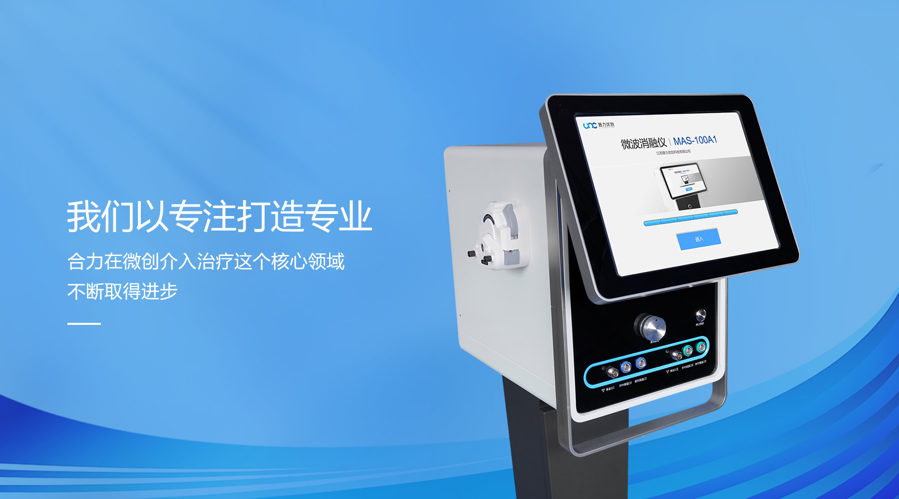 MAS-100A1型微波消融儀采用高效能全數字化微波固態源作為功率輸出源,雙源輸出,工作頻率為2450MHz,誤差不超過±50MHz,根據消融針承載安全功率適配。設備配備高靈敏度觸控屏。